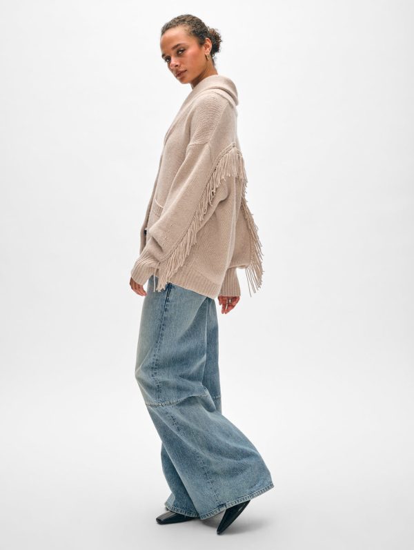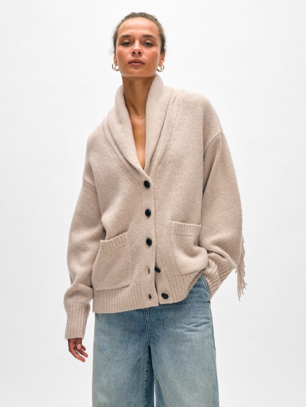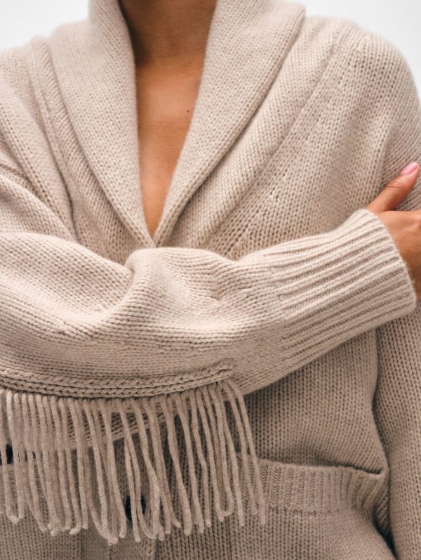 Crafted from a lofty merino wool-cashmere blend, this luxe coatigan combines timeless Western influences with a modern, cozy design. The shawl collar, patch pockets, and striking fringe details on the sleeves add rustic charm with a contemporary twist. Perfect as a jacket alternative or statement layer, this versatile piece elevates any look with comfort and style.