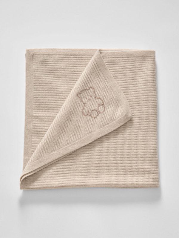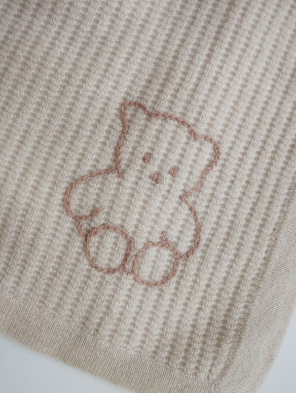 Discover the gift of luxury for your little ones with this embroidered baby blanket, crafted of 100% cashmere. Featuring a ribbed texture, this cozy knit boasts a chain-stitched bear at the corner for a subtle detail you’ll love.